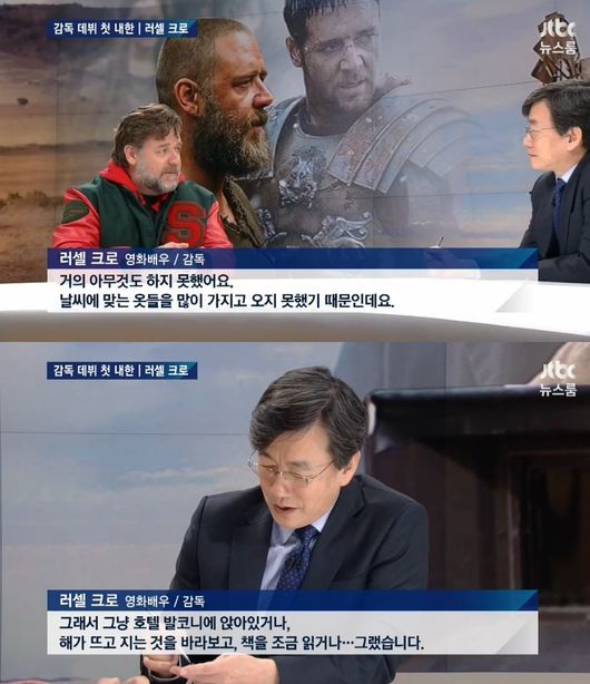 러셀 크로우는 20일 오후 방송된 JTBC ‘뉴스룸’ 2부에 출연해 배우에서 감독으로 변신한 이유와 그간의 출연작에 대한 기억, 할리우드 톱스타로서의 삶 등을 이야기했다.