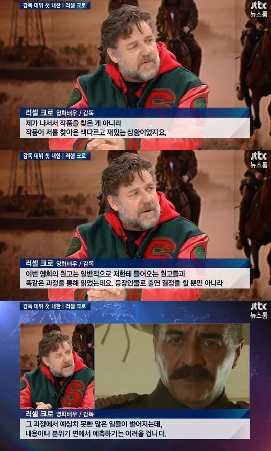 러셀 크로우는 20일 오후 방송된 JTBC ‘뉴스룸’ 2부에 출연해 배우에서 감독으로 변신한 이유와 그간의 출연작에 대한 기억, 할리우드 톱스타로서의 삶 등을 이야기했다.
