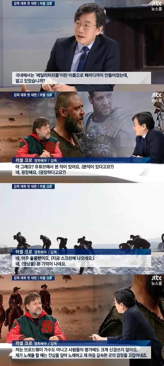 러셀 크로우는 20일 오후 방송된 JTBC ‘뉴스룸’ 2부에 출연해 배우에서 감독으로 변신한 이유와 그간의 출연작에 대한 기억, 할리우드 톱스타로서의 삶 등을 이야기했다.