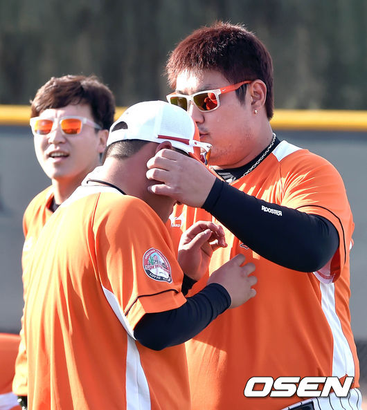 최준석이 손용석의 귀를 잡아 당기고 있다./spjj@osen.co.kr