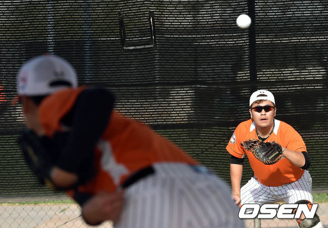 강민호가 심수창의 불펜 피칭을 받아주고 있다./spjj@osen.co.kr