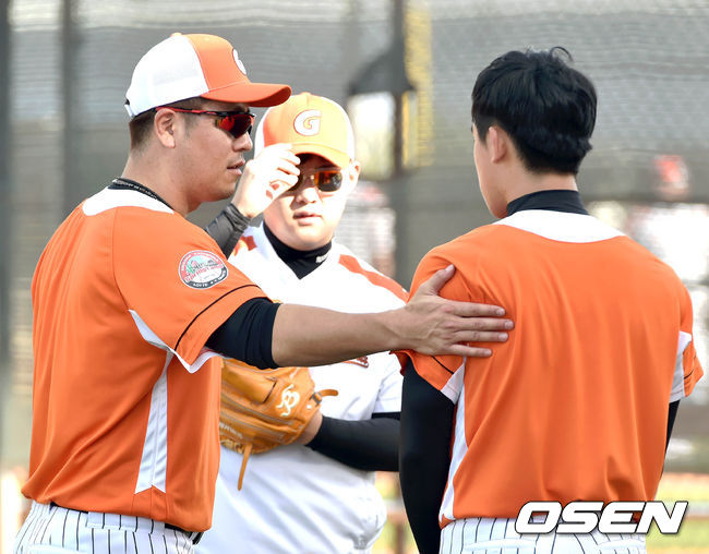 강민호가 차재용의 불펜피칭을 본 후 격려를 하고 있다./spjj@osen.co.kr
