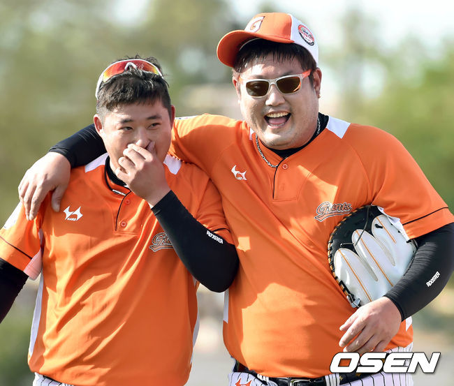 오전 훈련을 마친 최준석과 손용석이 밝은 표정으로 훈련장을 나오고 있다./spjj@osen.co.kr
