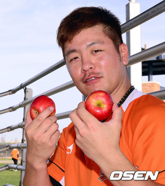 롯데 자이언츠 주전포수 강민호(30)가 오승환 따라잡기에 나섰다. 롯데 선수단의 스프링캠프가 한창인 21일(이하 한국시간) 애리조나 피오리아 스포츠 컴플렉스. 강민호는 휴식시간에 후배 장성우와 함께 앉아 사과를 먹고 있었다.