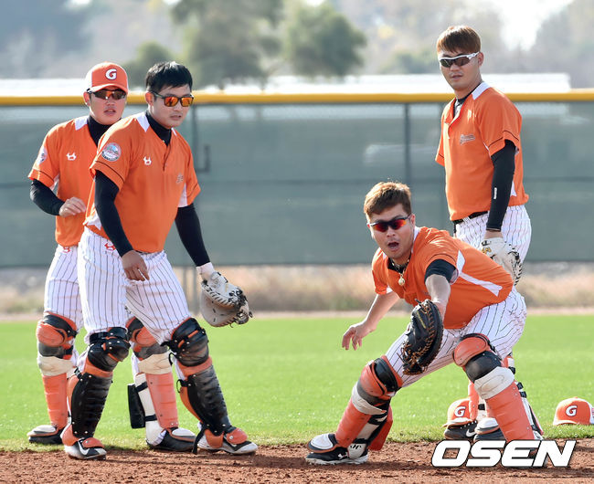 강민호와 포수조가 펑고 훈련을 하고 있다./spjj@osen.co.kr