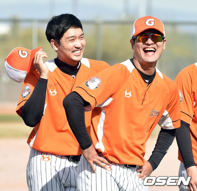 심수창과 이정민이 훈련중 환하게 웃고 있다./spjj@osen.co.kr