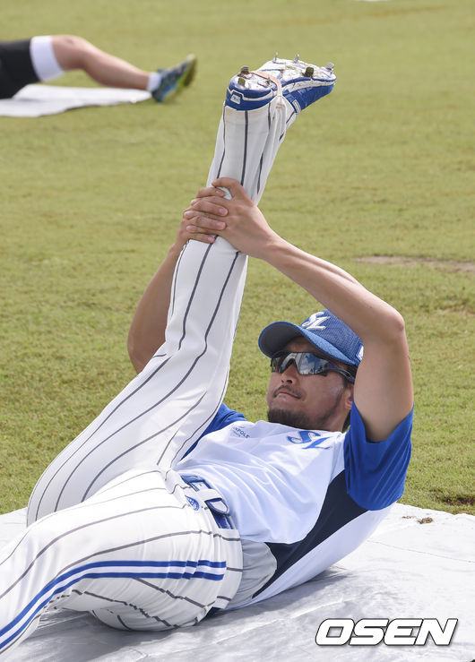 권오준이 스트레칭으로 몸을 풀고 있다.