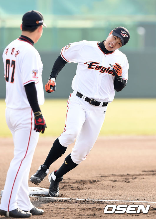 한화 정범모가 베이스러닝 훈련을 하고 있다.