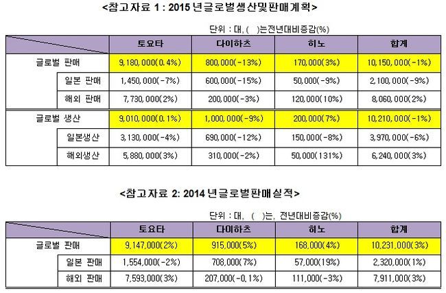 토요타는 2015년 글로벌 생산 및 판매계획을 각각 1,021만대와 1,015만대로 수립했다.