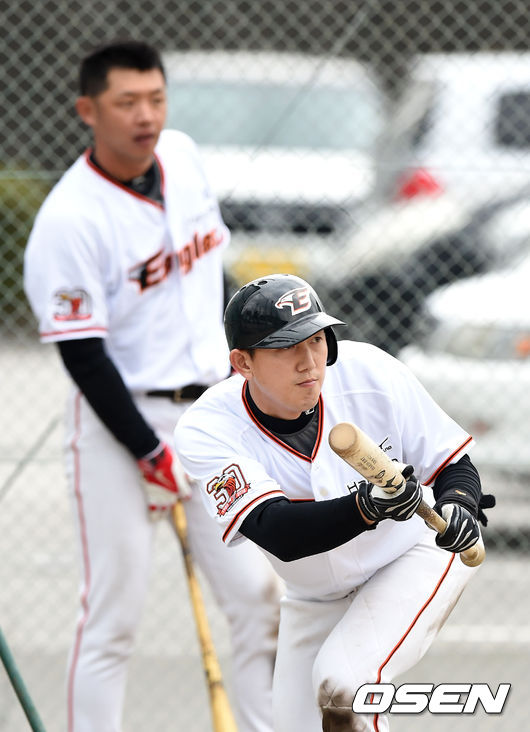 한화 김회성이 번트 훈련을 하고 있다.