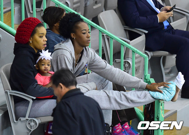 1세트, 부상으로 경기에 빠진 IBK 외국인선수 데스티니가 관중석에서 경기를 지켜보고 있다.