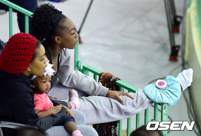 1세트, 부상으로 경기에 빠진 IBK 외국인선수 데스티니가 관중석에서 경기를 지켜보고 있다.