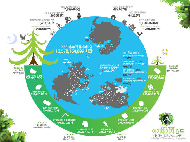 엑스엘게임즈의 간판게임 ‘아키에이지’가 서비스 2주년을 맞아 플레이어들의 발자취를 담은 인포그래픽을 공개했다.