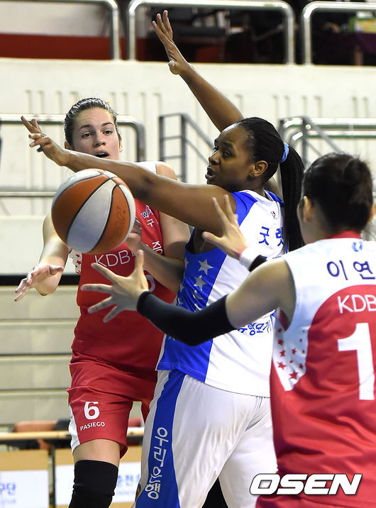 3쿼터 KDB생명 테일러가 우리은행 굿렛의 수비를 피해 패스를 하고 있다.