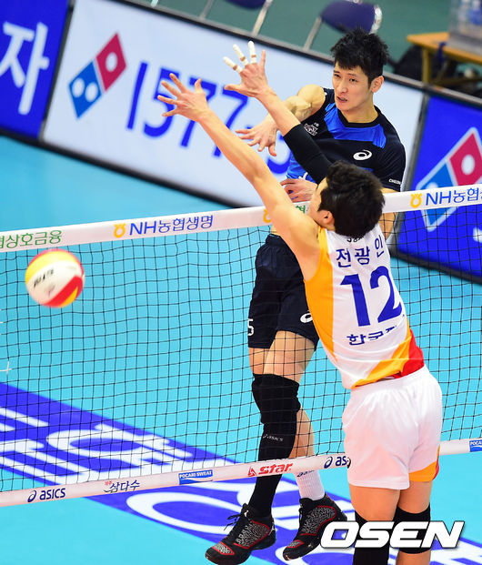 2세트, 현대캐피탈 문성민이 한국전력 전광인의 블로킹을 앞에두고 공격을 시도하고 있다.