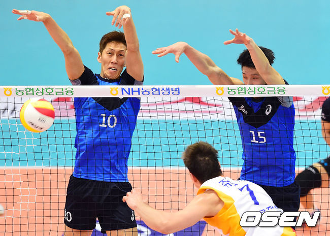 2세트, 현대캐피탈 윤봉우와 문성민이 한국전력 쥬리치의 공격을 블로킹 하고 있다.