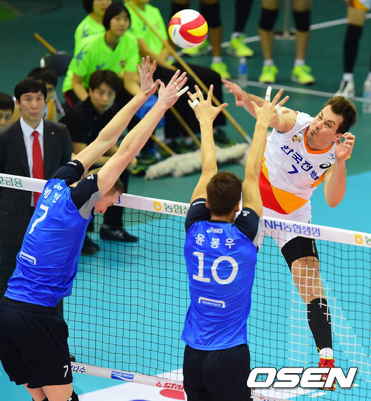 1세트, 한국전력 쥬리치가 현대캐피탈 케빈-윤봉우의 블로킹을 앞에두고 공격을 시도하고 있다.