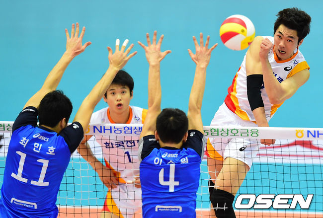 1세트, 한국전력 전광인이 현대캐피탈 이승원-최민호의 블로킹을 받으며 공격을 시도하고 있다.