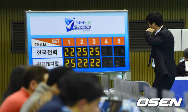 현대캐피탈은 21일 수원 실내체육관에서 열린 NH농협 2014~2015 V-리그 4라운드 한국전력과의 경기에서 1-3(25-22, 22-25, 22-25, 21-25)로 역전패했다. 2연패로 10승 14패가 된 5위 현대캐피탈은 승점 35점에 그대로 머물렀다. 4위 대한항공과의 격차는 승점 2점이다.