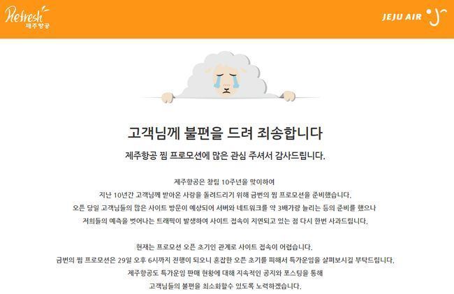그러나 막상 제주항공 홈페이지에 접속하면 사과 문구만 나오고 있다.