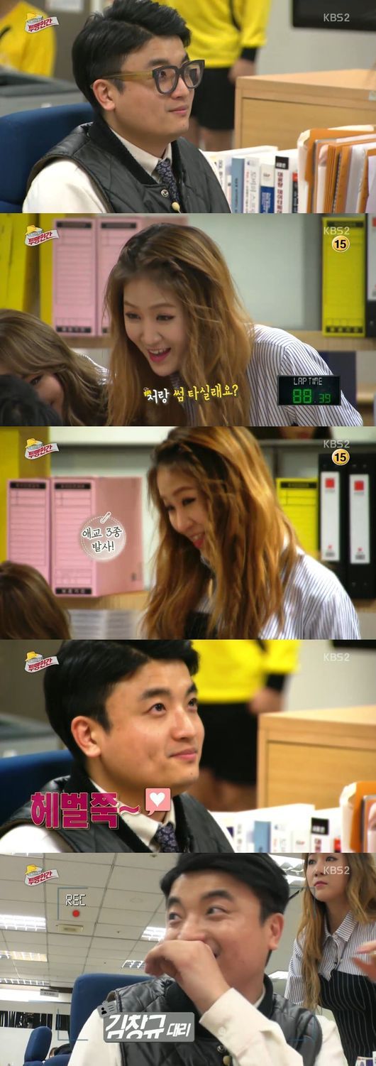 이날 김창규 대리를 상대로 도전에 나선 효린과 소유. 두 사람의 기습 공격에 환하게 웃고 있었던 김 대리는 애써 표정을 다잡았다. 이에 소유는 콧소리로 애교를 부리고, “저랑 썸 타실래요?”라는 유혹을 던졌다.