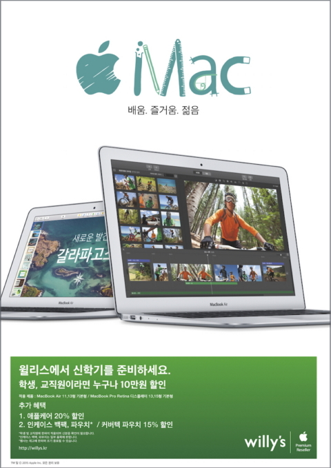 국내 애플 제품 판매 전문매장을 보유하고 있는 애플 프리미엄 리셀러 '윌리스(Willy's)'는 신학기를 맞아 1월 18일부터 3월 28일까지 세 달 간, 전국 윌리스 매장에서 애플 맥 노트북을 구입하는 학생 및 교직원 이용자들에게 10만 원의 가격 할인 뿐만 아니라, 품질보증 연장 서비스 할인, 백팩 및 파우치 등의 액세서리 주변기기 추가 할인 판매 등의 혜택을 제공한다.