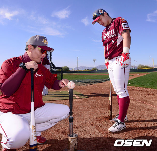 심재학 코치가 박동원에게 타점에 대해 이야기 하고 있다./spjj@osen.co.kr