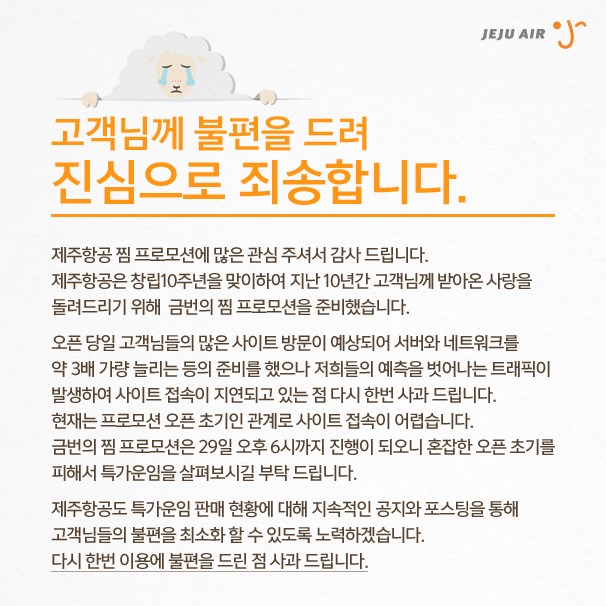 제주항공은 홈페이지에 "제주항공은 창립 10주년을 맞이하여 지난 10년간 고객님께 받아온 사랑을 돌려드리기 위해 금번의 찜 프로모션을 준비했습니다. 오픈 당일 고객님들의 많은 사이트 방문이 예상되어 서버와 네트워크를 약 3배가량 늘리는 등의 준비를 했으나 저희들의 예측을 벗어나는 트래픽이 발생하여 사이트 접속이 지연되고 있는 점 다시 한번 사과드립니다"라고 고개를 숙였다.