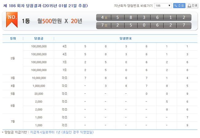 [OSEN=이슈팀] 제186회 연금복권 당첨번호가 공개됐다.