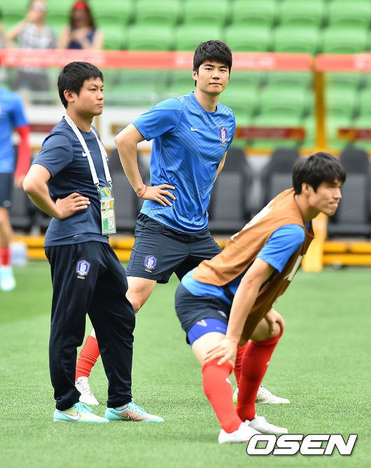 22일 오후(이하 한국시간) 호주 멜버른 렉탱귤러 스타디움서 슈틸리케 감독이 이끄는 한국 축구대표팀과 우즈베키스탄의 2015 AFC 호주 아시안컵대회 8강전 경기가 열릴 예정인 가운데 기성용, 김창수가 그라운드 위에서 몸을 풀고 있다.