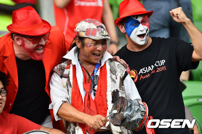 22일 오후(이하 한국시간) 호주 멜버른 렉탱귤러 스타디움서 슈틸리케 감독이 이끄는 한국 축구대표팀과 우즈베키스탄의 2015 AFC 호주 아시안컵대회 8강전 경기가 열릴 예정인 가운데 관중들이 열띤 응원을 하고 있다.