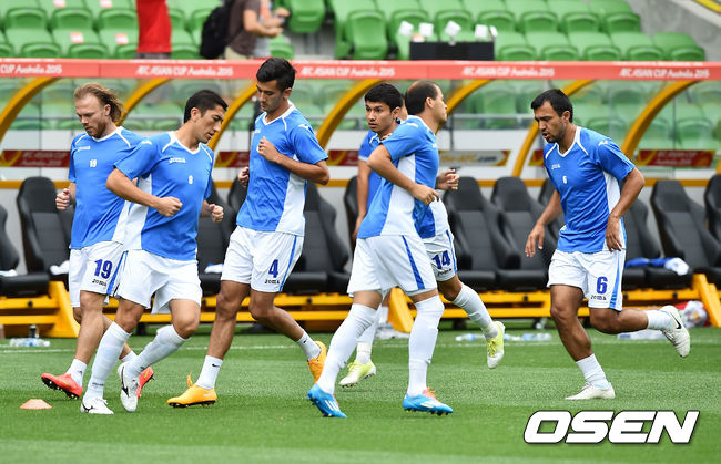 22일 오후(이하 한국시간) 호주 멜버른 렉탱귤러 스타디움서 슈틸리케 감독이 이끄는 한국 축구대표팀과 우즈베키스탄의 2015 AFC 호주 아시안컵대회 8강전 경기가 열릴 예정인 가운데 우즈벡 선수들이 그라운드 위에서 몸을 풀고 있다.