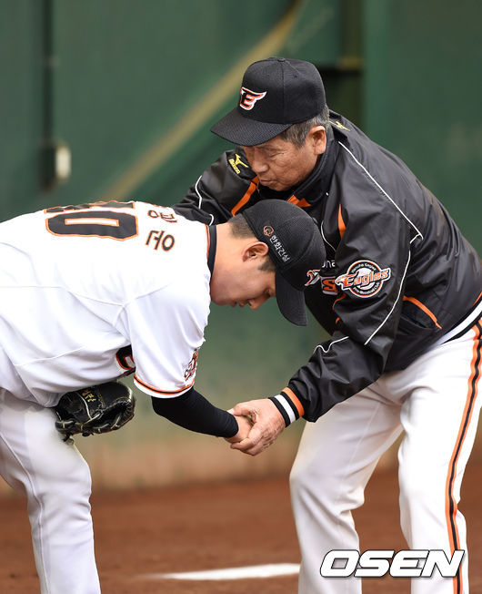 한화 김성근 감독이 정광운을 지도하고 있다.