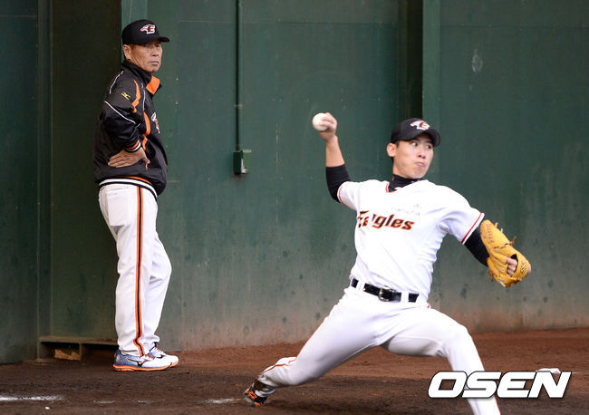 한화 김성근 감독이 불펜 투구를 하는 선수들을 바라보고 있다.