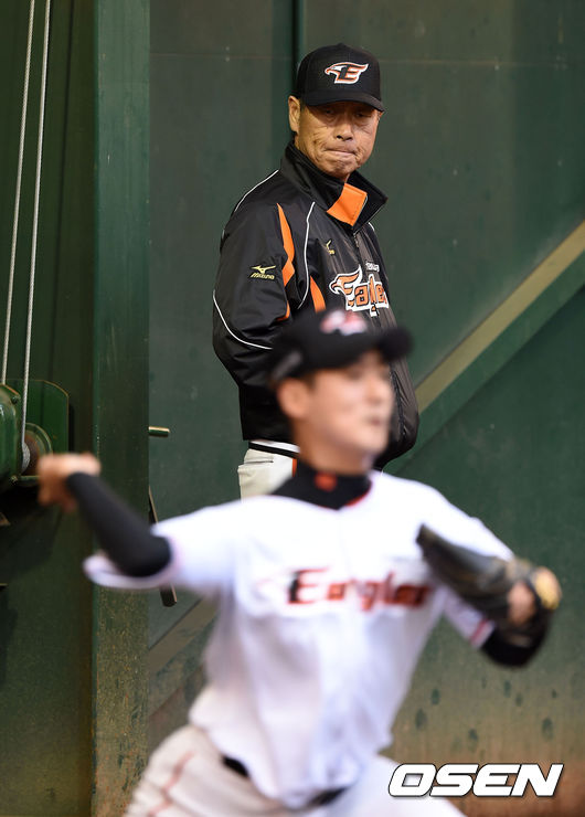 한화 김성근 감독이 불펜 투구 중인 선수들을 바라보고 있다.