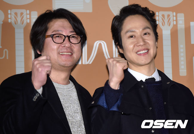 배우 김윤석, 정우가 포토타임을 갖고 있다.