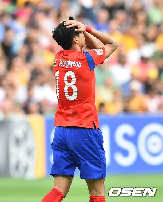 후반 이정협이 헤딩슛이 골키퍼에 막히자 아쉬워하고 있다.