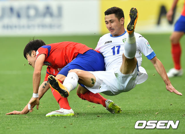 후반 김진수가 우즈벡 공격수와 볼을 다투고 있다.
