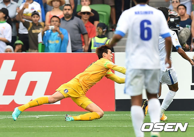 후반 김진현 골키퍼가 우즈벡 공격수에 앞서 볼을 처리하고 있다..