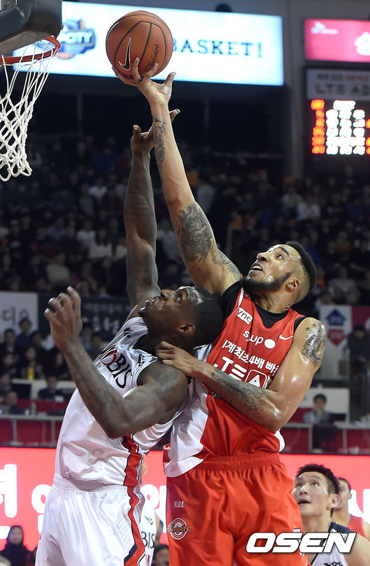 2쿼터 SK 심스와 모비스 라틀리프가 리바운드 다툼을 벌이고 있다.