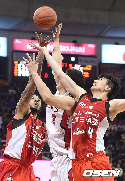 3쿼터 모비스 함지훈과 SK 심스, 박형철이 리바운드 다툼을 벌이고 있다.