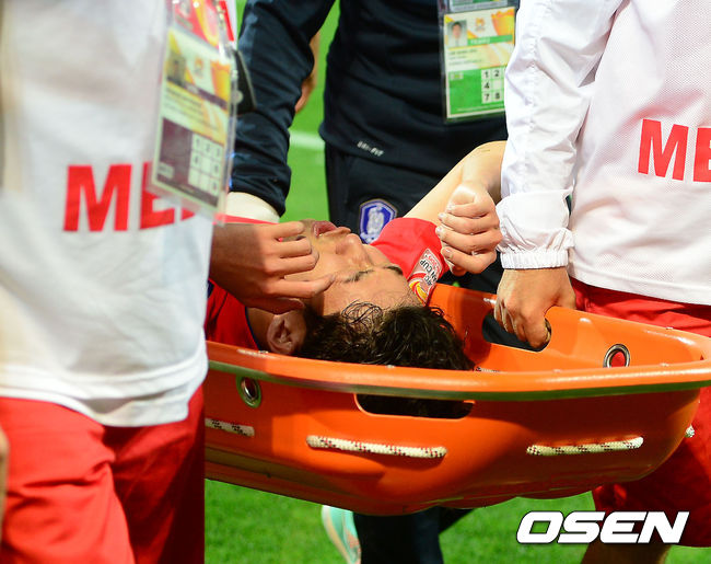 연장 후반 손흥민이 추가골을 성공시킨 후 다리에 쥐가 나 들것에 실려 나가고 있다./ rumi@osen.co.kr