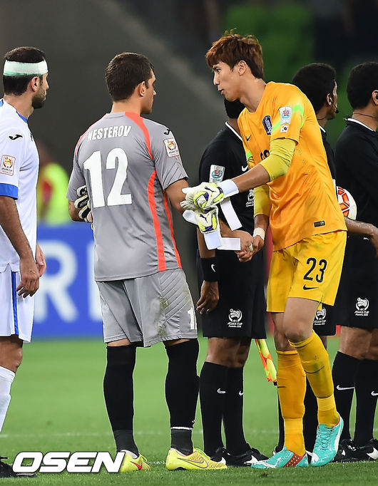 경기를 마치고 김진현이 우즈벡 골키퍼를 격려하고 있다./ rumi@osen.co.kr