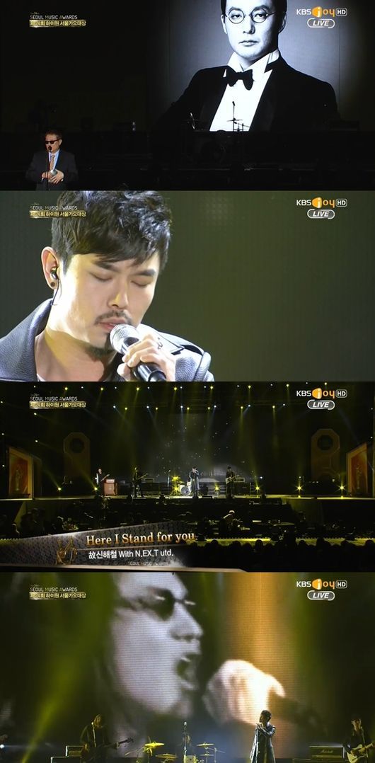 넥스트는 22일 오후 방송된 제24회 하이원 서울가요대상에서 故신해철을 추모하는 특별 무대를 선보였다.