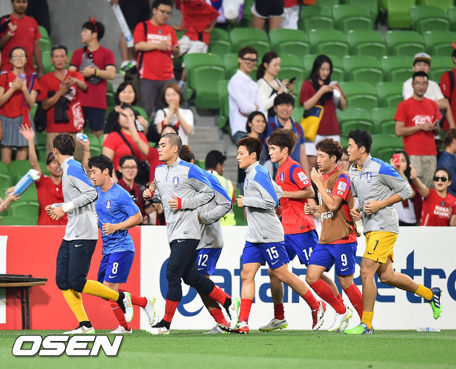 경기를 마치고 슈틸리케 감독의 지시로 오늘 경기에 뛰지 않은 선수들을 그라운드를 돌게하고 있다./ rumi@osen.co.kr