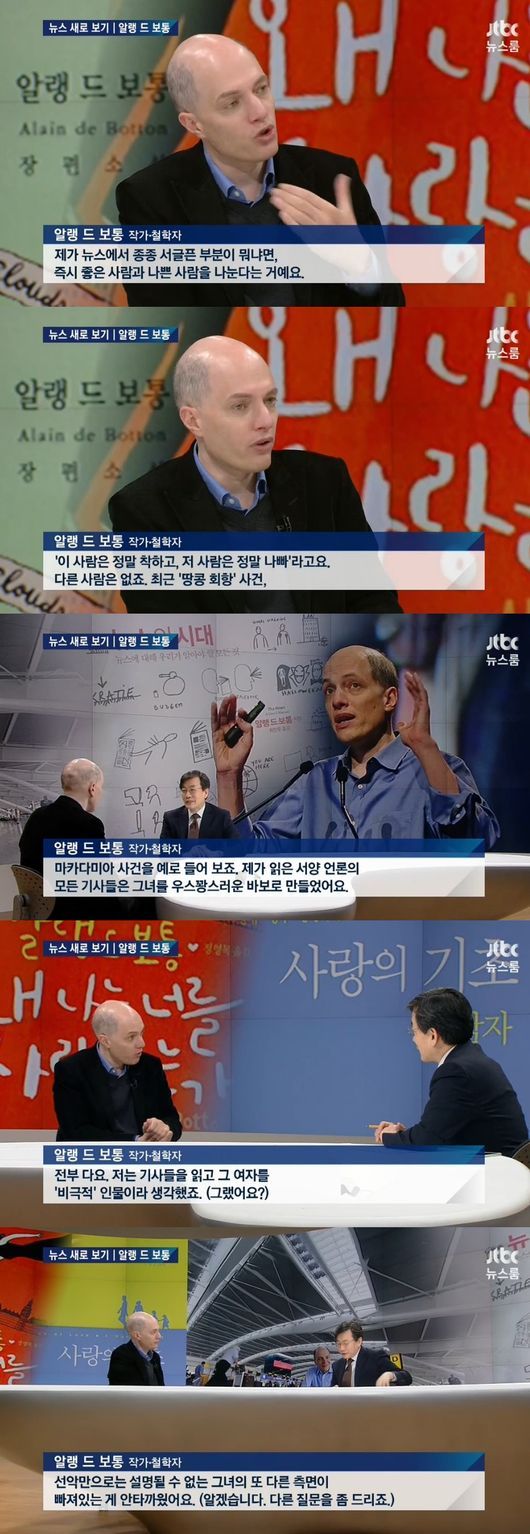 최근 '뉴스의 시대'를 발표, 현대 사회에서 뉴스가 갖는 힘과 역할에 주목한 알랭 드 보통이 22일 오후 방송된 JTBC '뉴스룸' 2부에 출연해 손석희 앵커와 대담을 나눴다.