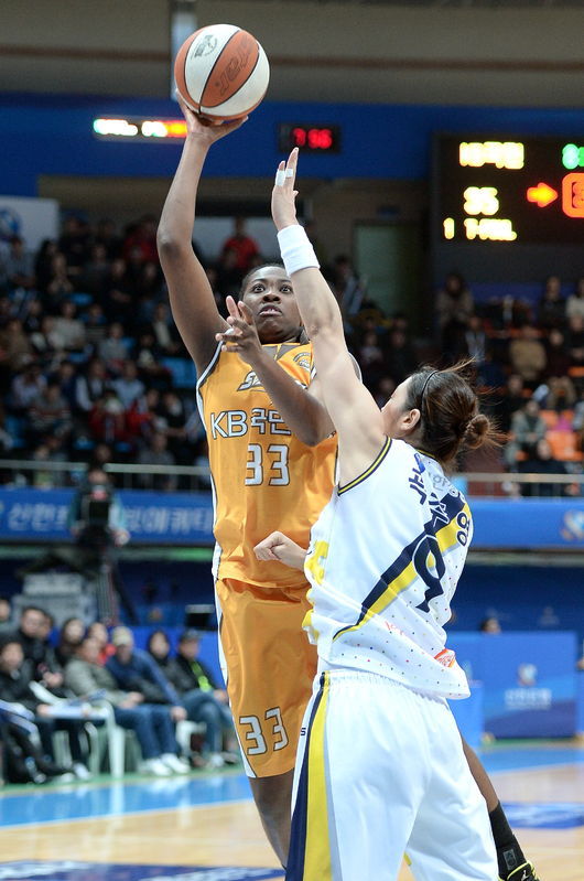 KB국민은행은 22일 인천 도원체육관에서 열린 신한은행과의 KB국민은행 2014~2015 여자프로농구 원정경기에서 외국인 선수 쉐키나 스트릭렌의 맹활약을 앞세워 68-62로로 승리했다.
