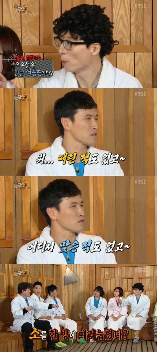 이날 유오성의 출연에 유재석은 “유오성씨는 ‘강남 싸움꾼’이란 이야기가 많이 들린다”고 말했다. 그러나 유오성은 “사실이 아니다. 저는 때린 적도 없고 어디서 맞은 적도 없다”고 해명했다.