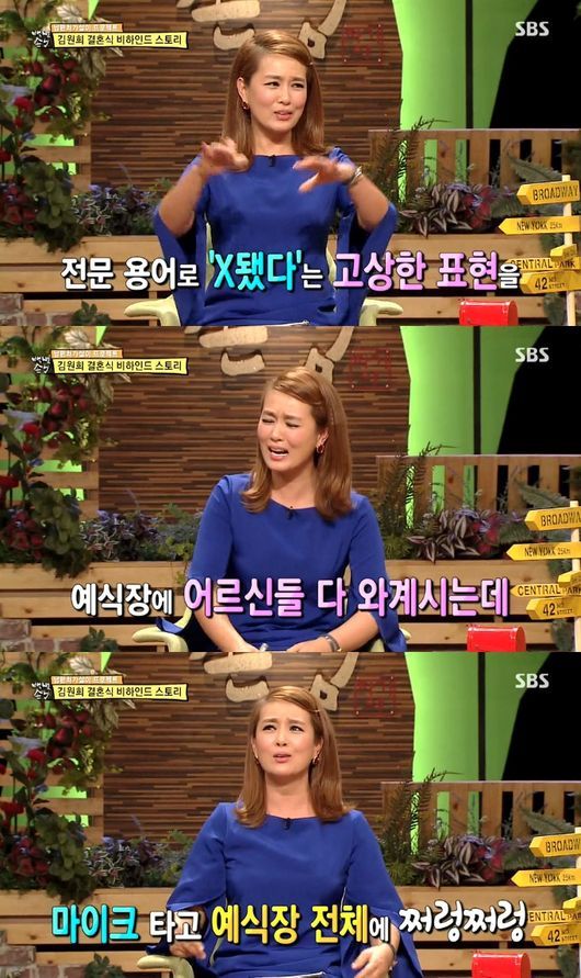 김원희는 22일 방송된 SBS 예능프로그램 ‘백년손님’에서 이만기가 결혼식에 다녀온 화면을 본 후 “내 결혼식 때 기자들이 많이 왔다. 기자들 있는 쪽에서 싸움이 났나보다. 갑자기 육두문자가 들렸다”라고 털어놨다.