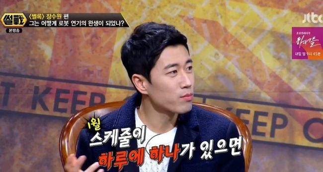 22일 방송된 JTBC '썰전'에서는 로봇연기 창시자 장수원이 출연했다. 그는 "계속 로봇연기를 하기가 쉽지 않다. 억지로 하면 시청자들이 바로 알아채나"고 말했다.